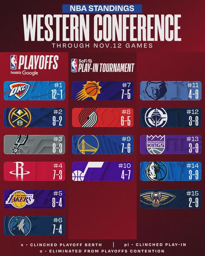 一边争冠军,一边争状元,本赛季正式上演。截至今天赛前,雷霆12胜1负领跑全联盟,领先东部第一的活塞1.5个胜场,领先西部第二的掘金2个胜场。别忘了,雷霆二当家杰伦-威廉姆斯还在养伤,本赛季一场都没打过。